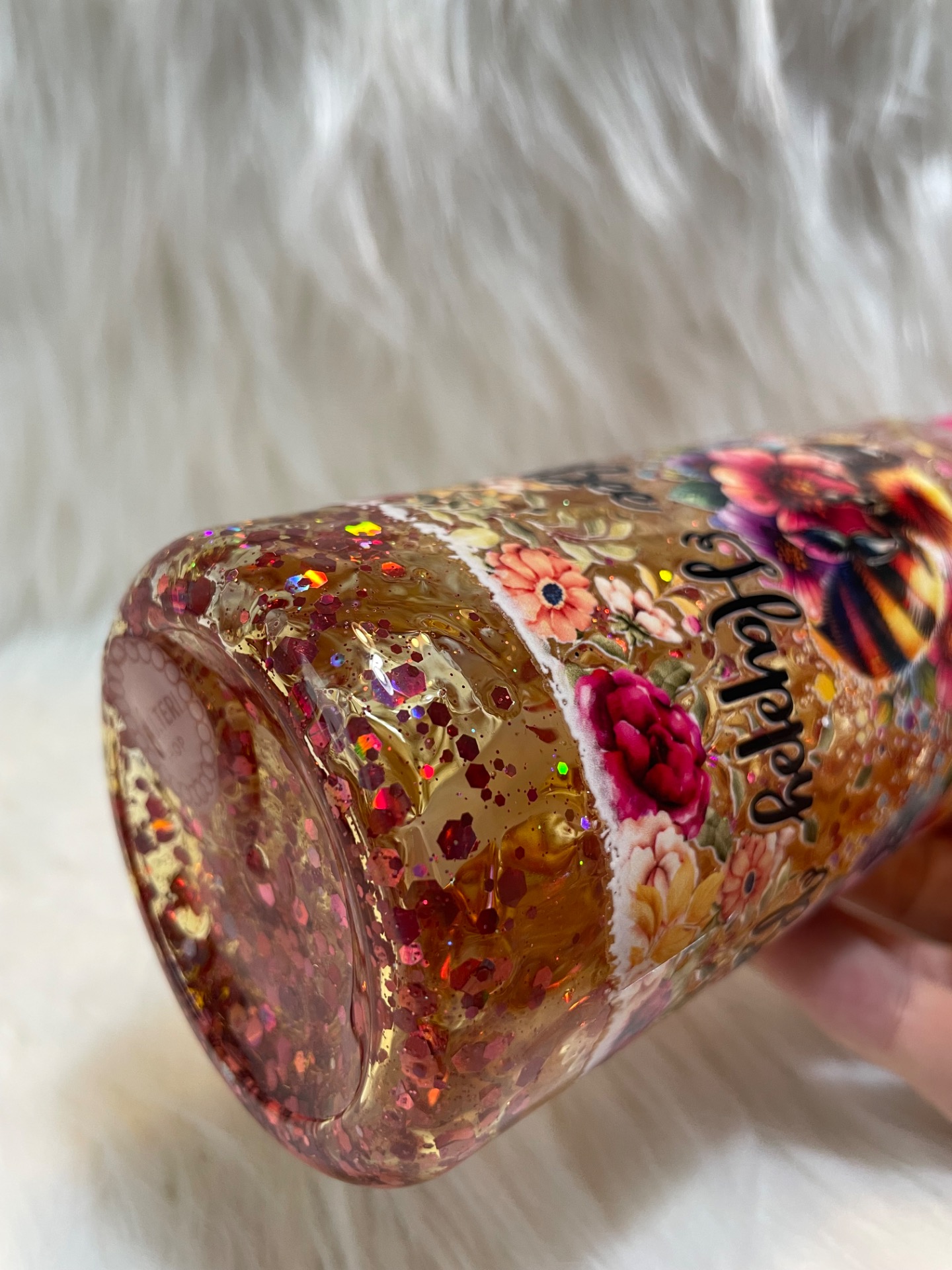- Třpytivý glitter efekt se zlatými, červenými a růžovými flitry