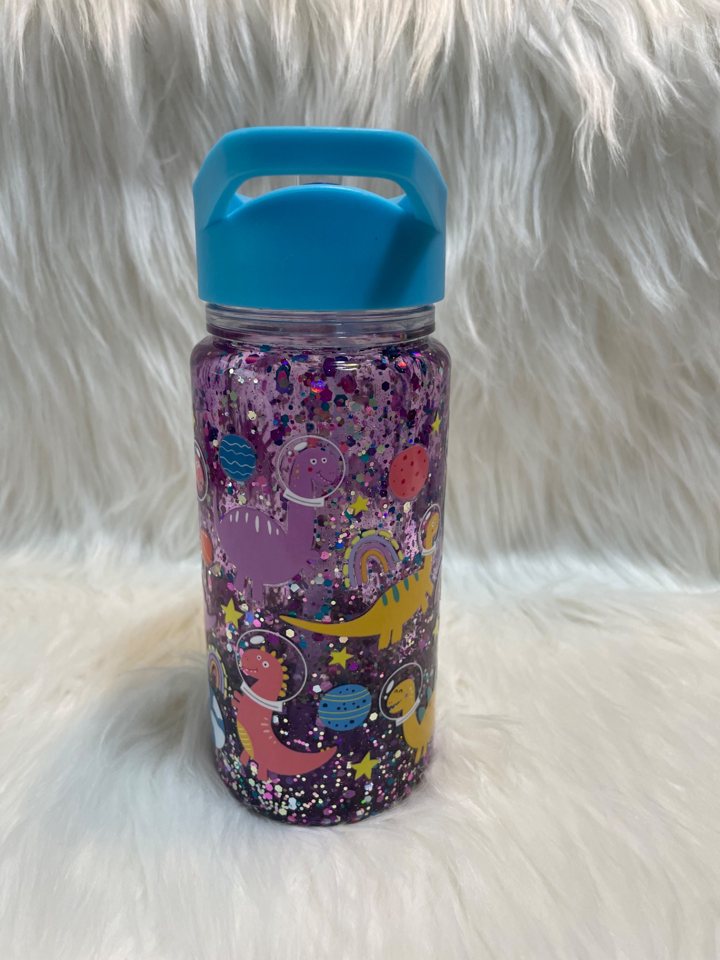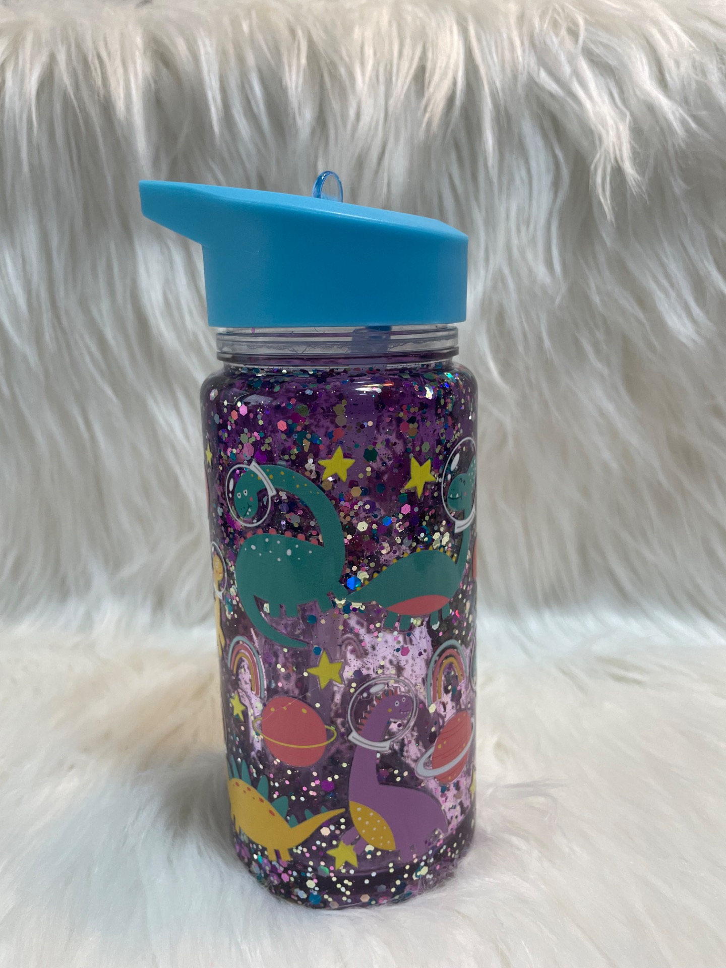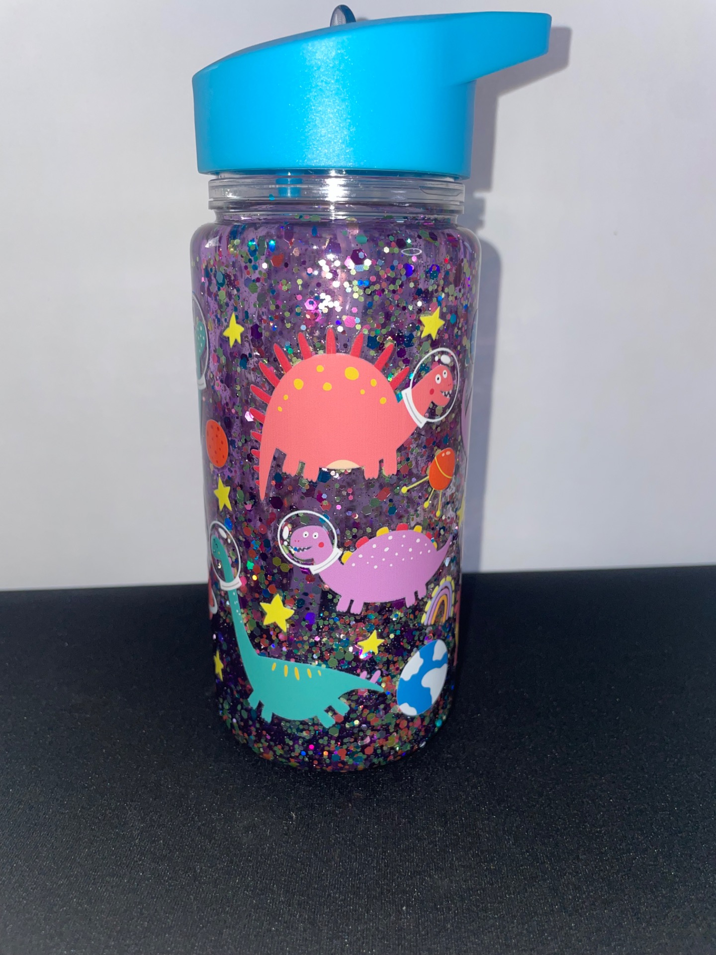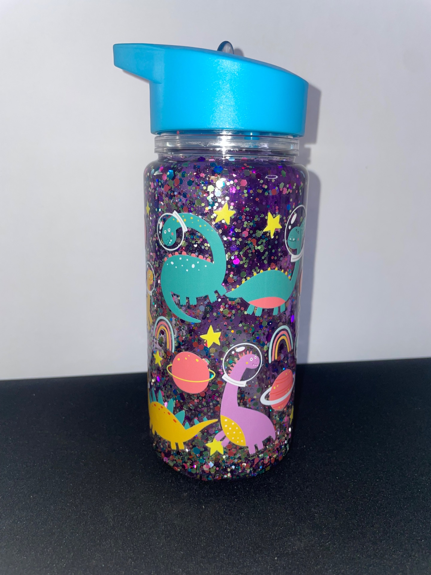 Barevní dinosauři ve skafandrech, planety, hvězdy a duhy dodávají sklenici hravý a magický vzhled. Díky modrému víčku s výklopným brčkem je ideální pro děti i všechny milovníky fantazie a vesmírných motivů.
